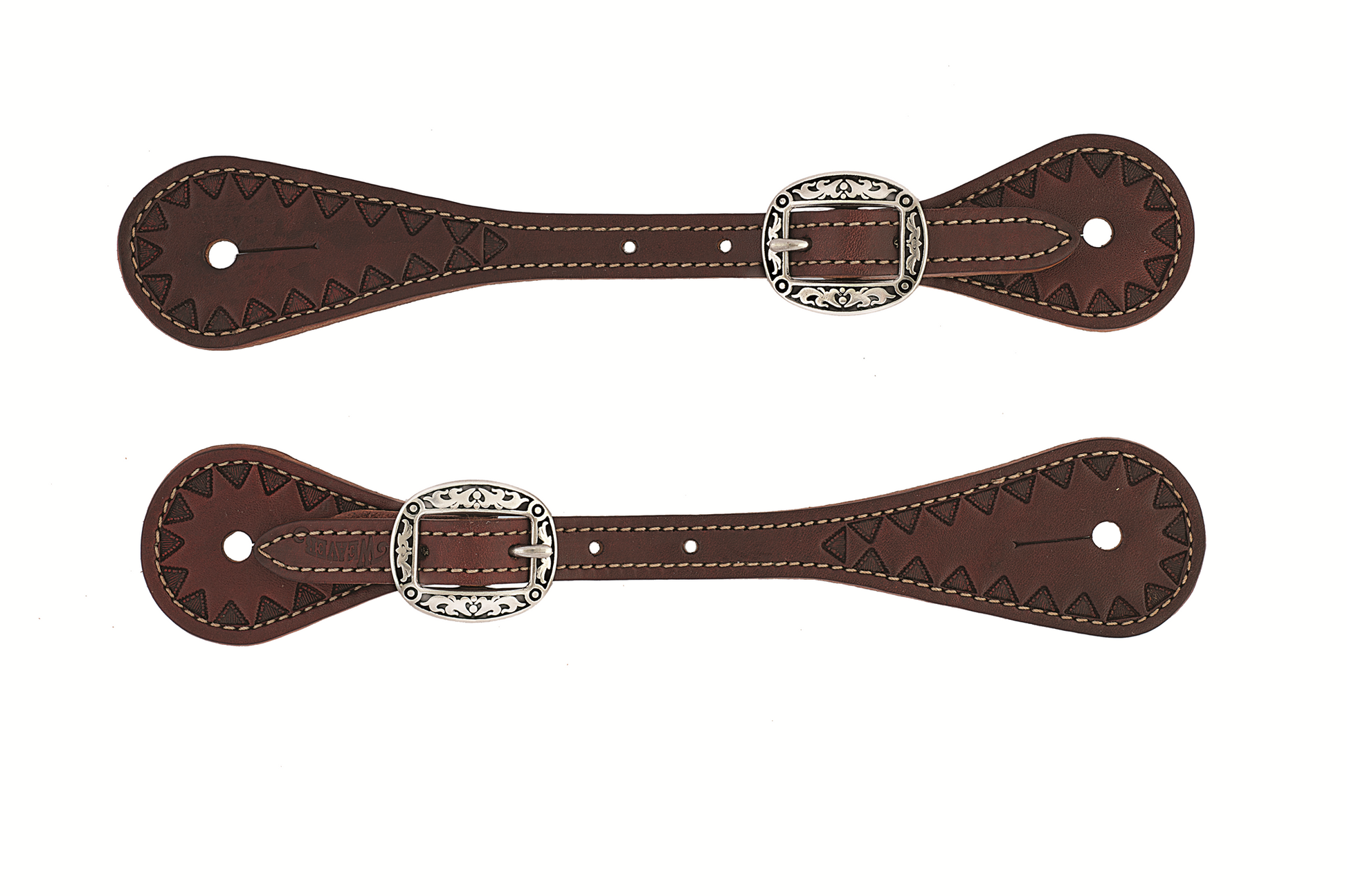 The Youth Hand-Tooled Triangle Border Spur Straps in Chestnut boast a distinctive triangle border, showcasing artisanal excellence. The floral engraved buckles with black accents add a touch of sophistication. Designed for everyday riding, these spur straps combine simplicity and functionality. Sold as a pair, they provide a complete and stylish addition to your equestrian gear collection, ensuring both quality craftsmanship and eye-catching details for confident and fashionable rides.