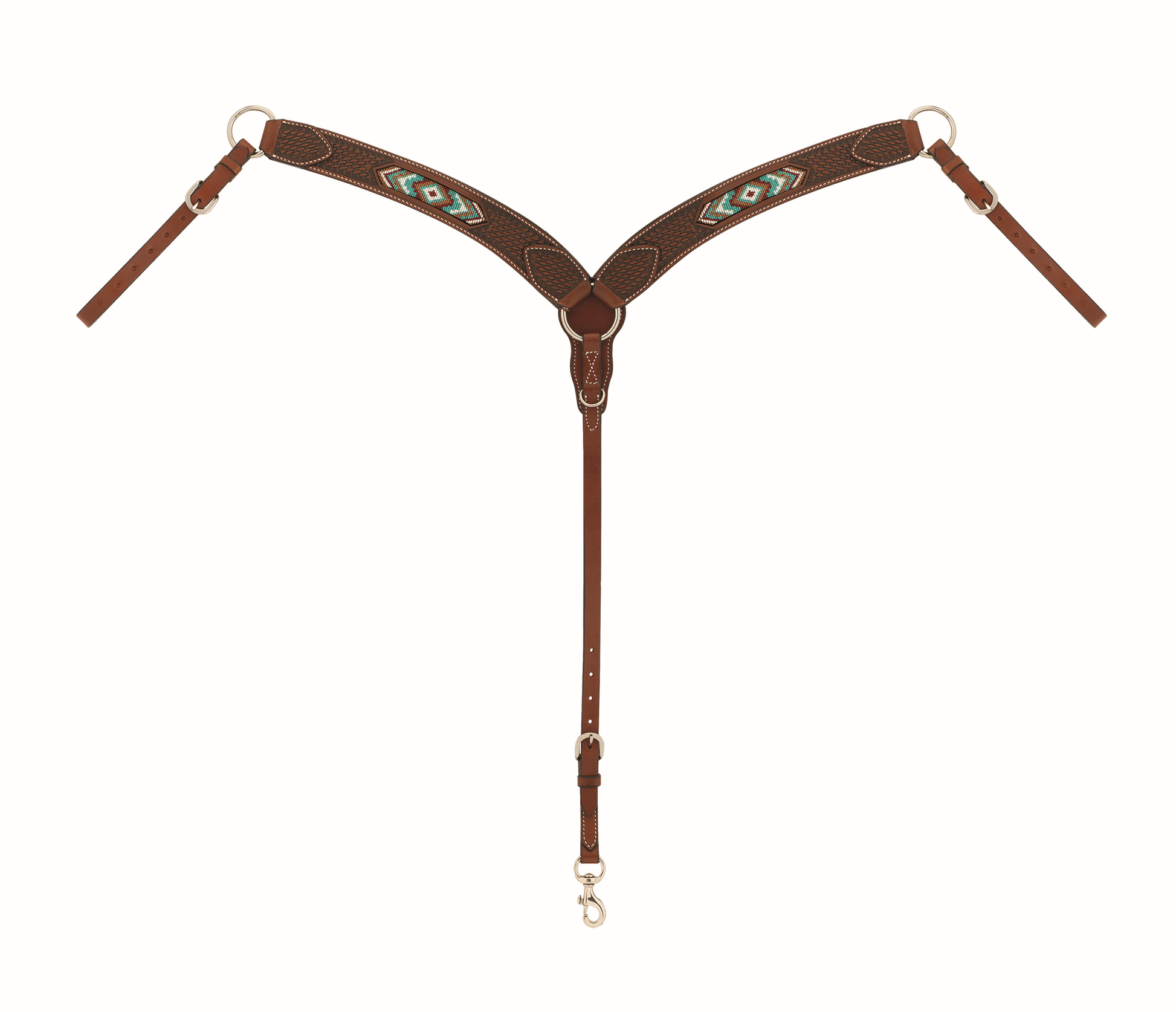 The Beaded Collection is crafted from rich chestnut colored leather, delivering a rugged and refined look. Each piece features durable SS hardware for dependable performance. The vibrant multi color beaded inlays add a lively and decorative touch, while the intricate basket weave tooling offers additional texture and detail. This collection combines durability with unique style, making it a standout choice for those who appreciate both functionality and distinctive design in their tack.