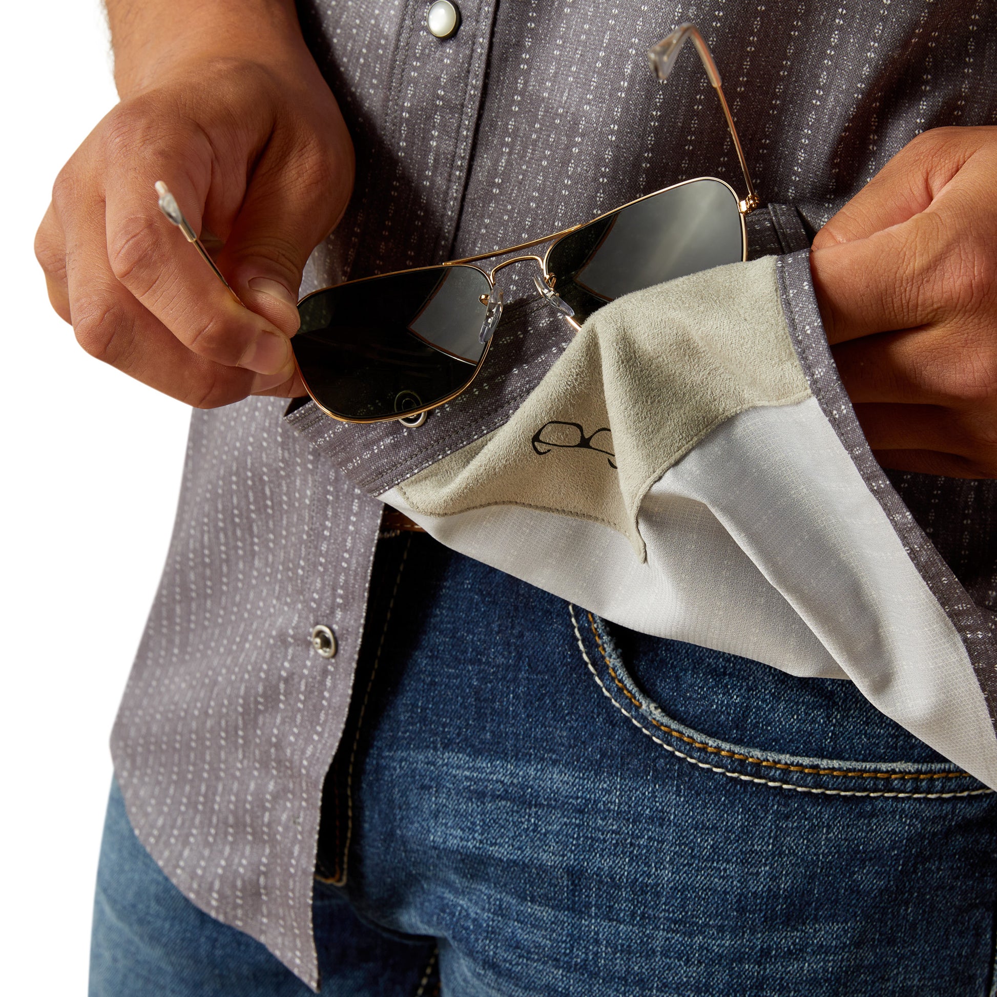 - Microfiber lens cloth is hidden in the hem for on-the-go cleaning